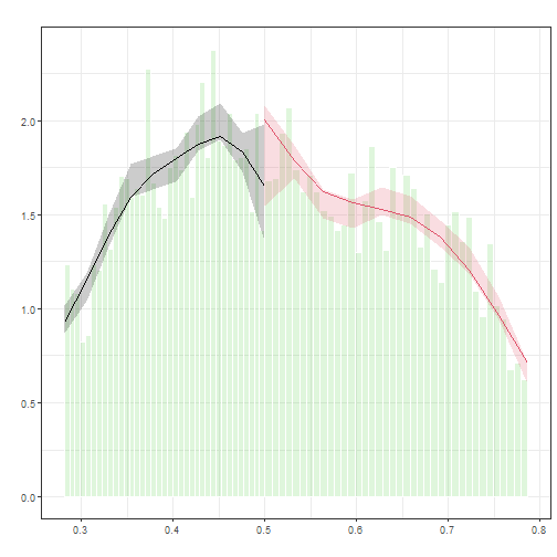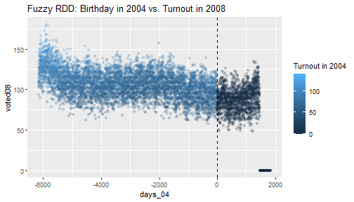 ] .date[ ### April 30 and May 5, 2026 ] --- class: center, middle <style type="text/css"> pre { max-height: 400px; overflow-y: auto; } pre[class] { max-height: 200px; } </style> ###Today's Plan 1. Why RDD? 2. RDD assumptions 3. Bandwidth selection 4. Sharp vs. fuzzy RDD 5. Visualization 6. Estimation strategies 7. Diagnostics 8. Reporting --- ### RDD - An RDD can be analyzed by comparing simple average scores just above and just below the threshold. - Alternatively, a (simple or complex) statistical model may be used to extrapolate from the data just above and just below the threshold. --- <img src="images/Lee1.png" width="90%" style="display: block; margin: auto;" /> --- <img src="images/Lee2.png" width="90%" style="display: block; margin: auto;" /> --- ``` r #This coding example due to Yuta Toyama. demmeans <- split(lmb_data$democrat, cut(lmb_data$lagdemvoteshare, 100)) %>% lapply(mean) %>% unlist() agg_lmb_data <- data.frame(democrat = demmeans, lagdemvoteshare = seq(0.01,1, by = 0.01)) ``` --- ``` r lmb_data <- lmb_data %>% mutate(gg_group = if_else(lagdemvoteshare > 0.5, 1,0)) gg_srd = ggplot(data=lmb_data, aes(lagdemvoteshare, democrat)) + geom_point(aes(x = lagdemvoteshare, y = democrat), data = agg_lmb_data) + xlim(0,1) + ylim(-0.1,1.1) + geom_vline(xintercept = 0.5) + xlab("Democrat Vote Share, time t") + ylab("Probability of Democrat Win, time t+1") + scale_y_continuous(breaks=seq(0,1,0.2)) + ggtitle(TeX("Effect of Initial Win on Winning Next Election: $\\P^D_{t+1} - P^R_{t+1}$")) ``` --- ``` r gg_srd + stat_smooth(aes(lagdemvoteshare, democrat, group = gg_group), method = "lm" , formula = y ~ x + I(x^2)) ``` <img src="5regressiondiscontinuitydesigns_files/figure-html/unnamed-chunk-7-1.png" width="70%" style="display: block; margin: auto;" /> --- ``` r gg_srd + stat_smooth(data=lmb_data %>% filter(lagdemvoteshare>.45 & lagdemvoteshare<.55), aes(lagdemvoteshare, democrat, group = gg_group), method = "lm", formula = y ~ x + I(x^2)) ``` <img src="5regressiondiscontinuitydesigns_files/figure-html/unnamed-chunk-8-1.png" width="70%" style="display: block; margin: auto;" /> --- <img src="5regressiondiscontinuitydesigns_files/figure-html/unnamed-chunk-9-1.png" width="50%" style="display: block; margin: auto;" /> --- ``` r lmb_subset <- lmb_data %>% filter(lagdemvoteshare>.48 & lagdemvoteshare<.52) lm_1 <- lm_robust(score ~ lagdemocrat, data = lmb_subset, se_type = "HC1") summary(lm_1) ``` ``` ## ## Call: ## lm_robust(formula = score ~ lagdemocrat, data = lmb_subset, se_type = "HC1") ## ## Standard error type: HC1 ## ## Coefficients: ## Estimate Std. Error t value Pr(>|t|) CI Lower CI Upper DF ## (Intercept) 31.20 1.334 23.39 3.788e-95 28.58 33.81 913 ## lagdemocrat 21.28 1.951 10.91 3.987e-26 17.45 25.11 913 ## ## Multiple R-squared: 0.1152 , Adjusted R-squared: 0.1142 ## F-statistic: 119 on 1 and 913 DF, p-value: < 2.2e-16 ``` --- ``` ## ## Call: ## lm_robust(formula = score ~ lagdemocrat, data = lmb_subset, se_type = "HC1") ## ## Standard error type: HC1 ## ## Coefficients: ## Estimate Std. Error t value Pr(>|t|) CI Lower CI Upper DF ## (Intercept) 31.20 1.334 23.39 3.788e-95 28.58 33.81 913 ## lagdemocrat 21.28 1.951 10.91 3.987e-26 17.45 25.11 913 ## ## Multiple R-squared: 0.1152 , Adjusted R-squared: 0.1142 ## F-statistic: 119 on 1 and 913 DF, p-value: < 2.2e-16 ``` --- ### A Second Example <img src="images/Dahlgaard1.png" width="90%" style="display: block; margin: auto;" /> --- <img src="images/Dahlgaard2.png" width="70%" style="display: block; margin: auto;" /> --- ### The Key Assumption *Continuity Assumption*: The conditional expectations of potential outcomes `\(\text{E}[Y_C|X]\)` and `\(\text{E}[Y_T|X]\)` are continuous in the assignment variable `\(X\)` in the neighborhood of the cutoff `\(c\)`. * Under this assumption, an observed discontinuity at `\(c\)` is going to be a plausible estimator of the local treatment effect. --- ### RDD Windows - How wide a window above and below the break point? --- ``` r lmb_subset <- lmb_data %>% filter(lagdemvoteshare>.49 & lagdemvoteshare<.51) lm_1 <- lm_robust(score ~ lagdemocrat, data = lmb_subset, se_type = "HC1") summary(lm_1) ``` ``` ## ## Call: ## lm_robust(formula = score ~ lagdemocrat, data = lmb_subset, se_type = "HC1") ## ## Standard error type: HC1 ## ## Coefficients: ## Estimate Std. Error t value Pr(>|t|) CI Lower CI Upper DF ## (Intercept) 31.71 1.938 16.358 4.539e-47 27.90 35.52 428 ## lagdemocrat 23.97 2.799 8.564 1.985e-16 18.47 29.47 428 ## ## Multiple R-squared: 0.1453 , Adjusted R-squared: 0.1433 ## F-statistic: 73.34 on 1 and 428 DF, p-value: < 2.2e-16 ``` --- ``` r lmb_subset <- lmb_data %>% filter(lagdemvoteshare>.495 & lagdemvoteshare<.505) lm_1 <- lm_robust(score ~ lagdemocrat, data = lmb_subset, se_type = "HC1") summary(lm_1) ``` ``` ## ## Call: ## lm_robust(formula = score ~ lagdemocrat, data = lmb_subset, se_type = "HC1") ## ## Standard error type: HC1 ## ## Coefficients: ## Estimate Std. Error t value Pr(>|t|) CI Lower CI Upper DF ## (Intercept) 29.55 2.547 11.600 3.574e-24 24.52 34.57 202 ## lagdemocrat 29.13 3.845 7.577 1.250e-12 21.55 36.72 202 ## ## Multiple R-squared: 0.2177 , Adjusted R-squared: 0.2138 ## F-statistic: 57.41 on 1 and 202 DF, p-value: 1.25e-12 ``` --- ### RDD > Irrespective of the manner in which the bandwidth is chosen, one > should always investigate the sensitivity of the inferences to this > choice, for example, by including results for bandwidths twice (or > four times) and half (or a quarter of) the size of the originally > chosen bandwidth. Obviously, such bandwidth choices affect both > estimates and standard errors, but if the results are critically > dependent on a particular bandwidth choice, they are clearly less > credible than if they are robust to such variation in bandwidths. > (Imbens and Lemieux 2008) --- ### RDD - Green, Leong, Kern, Gerber, and Larimer find that an estimate of the optimal bandwidth proposed by Imbens and Kalyanaraman, in conjunction with local linear r
