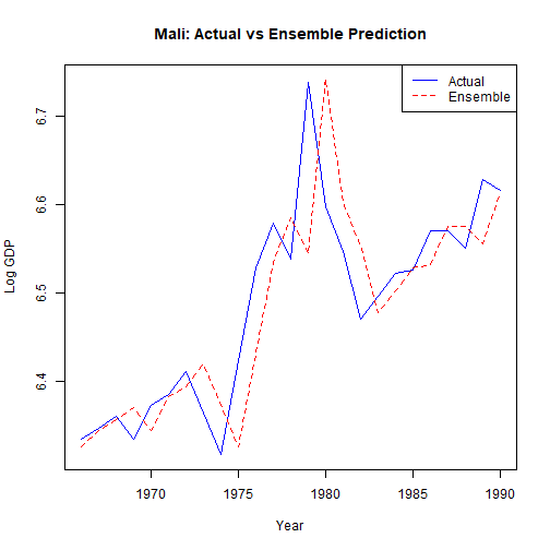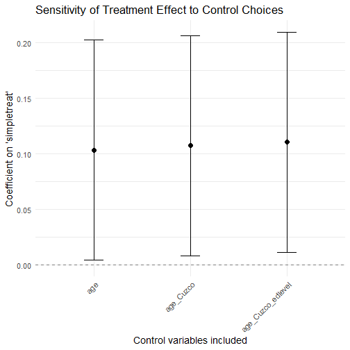 ] .date[ ### May 14 and May 19, 2026 ] --- class: center, middle <style type="text/css"> pre { max-height: 400px; overflow-y: auto; } pre[class] { max-height: 200px; } </style> ### Manufacture Perfect Comparisons Strictly speaking, for the Method of Difference to work based on a comparison between cases 1 and 2, the condition which must be met is: `$$\begin{aligned} Y_{1,t} = Y_{2,t}\\ Y_{1,c} = Y_{2,c}\end{aligned}$$` --- ### Manufacture Perfect Comparisons No observable condition can ever guarantee that this assumption is met, but if we were to find two cases that *exactly* match on a suitably rich set of background variables `\(\mathbb{Z}\)`, perhaps, we would come close to believing the assumption. --- ### Manufacture Perfect Comparisons Unfortunately, if `\(\mathbb{Z}\)` is indeed a reasonably deep list of variables, we are unlikely to find cases that in fact exactly match (or even come particularly close). --- ### Manufacture Perfect Comparisons Abadie and collaborators suggest that we create our own "synthetic" control cases, by averaging together existing control cases to come as close as possible to exactly matching the treatment case on `\(\mathbb{Z}\)`. --- ### Synthetic Control The setup is one in which there are `\(N\)` cases, each of which is observed at multiple time periods labeled from 1 through `\(T\)`. --- ### Synthetic Control Each case has a treatment and control potential outcome for each time period. The difference between these is: `\(\alpha_{i,t} = Y^T_{i,t} - Y^C_{i,t}\)` --- ### Synthetic Control Suppose that the treatment of interest happens in *one* case at one time period. That is, `\(D_{j,t}=0\)` for all `\(j \neq i\)` and for all `\(t < t_{treat}\)`. --- ### Synthetic Control Let `\(X_{i} = (\mathbb{Z}_{i}, Y_{i})\)` Minimize `\(X_{i, t} - \mathbb{X}_{j, t} W\)` for `\(t < t_{treat}\)`. --- ### Synthetic Control `\(\sqrt{(X_{i, t} - \mathbb{X}_{j, t} W)^{T} V (X_{i, t} - \mathbb{X}_{j, t} W)}\)` --- <img src="images/choosingv.png" width="90%" style="display: block; margin: auto;" /> --- <img src="images/chavezsynth.png" width="90%" style="display: block; margin: auto;" /> --- <img src="images/chavezsynth2.png" width="90%" style="display: block; margin: auto;" /> --- <img src="images/chavezsynth3.png" width="90%" style="display: block; margin: auto;" /> --- <img src="images/chavezsynth4.png" width="90%" style="display: block; margin: auto;" /> --- <img src="images/chavezsynth5.png" width="90%" style="display: block; margin: auto;" /> --- <img src="images/chavezsynth6.png" width="90%" style="display: block; margin: auto;" /> --- <img src="images/chavezsynth7.png" width="90%" style="display: block; margin: auto;" /> --- <img src="images/chavezsynth8.png" width="90%" style="display: block; margin: auto;" /> --- <img src="images/chavezsynth9.png" width="90%" style="display: block; margin: auto;" /> --- <img src="images/DeKadt1.png" width="90%" style="display: block; margin: auto;" /> --- <img src="images/DeKadt2.png" width="90%" style="display: block; margin: auto;" /> --- <img src="images/DeKadt3.png" width="90%" style="display: block; margin: auto;" /> --- <img src="images/DeKadt4.png" width="90%" style="display: block; margin: auto;" /> --- ``` r library(Synth) ``` ``` ## ## ## ## Synth Package: Implements Synthetic Control Methods. ``` ``` ## ## See https://web.stanford.edu/~jhain/synthpage.html for additional information. ``` --- ``` r afripanel <- read.csv("https://github.com/jnseawright/PS406/raw/main/data/afripanel.csv") malidata <- afripanel[afripanel$WBCode=="MLI" | afripanel$cont_dem_ind==1,] malicontrols <- unique(malidata$WBCode[malidata$WBCode!="MLI"&malidata$WBCode!="ETH"&malidata$WBCode!="SDN"]) ``` --- ``` r mali.prep <- dataprep( foo=malidata, predictors=c( "lngdpmadlag", "lngdpmadlag2", "lngdpmadlag3", "lngdpmadlag4", "lnpop", "ki", "openk", "civwar", "civwarend", "pwt_xrate", "pwt_xrate_lag1", "pwt_xrate_lag2", "pwt_xrate_lag3", "eximdiff", "eximdiff_lag1", "eximdiff_lag2", "wbank", "wbank_lag1", "wbank_lag2", "imfadj", "imfadj_lag1", "imfadj_lag2" ), dependent="lngdpmad", unit.variable="wbcode2", time.variable="year", treatment.identifier="MLI", controls.identifier=malicontrols, time.predictors.prior=c(1975:1990), time.optimize.ssr=c(1975:1991), time.plot=c(1975:2008), unit.names.variable="WBCode" ) ``` ``` ## ## Missing data- treated unit; predictor: eximdiff ; for period: 1975 ## We ignore (na.rm = TRUE) all missing values for predictors.op. ## ## Missing data- treated unit; predictor: eximdiff ; for period: 1976 ## We ignore (na.rm = TRUE) all missing values for predictors.op. ## ## Missing data- treated unit; predictor: eximdiff ; for period: 1977 ## We ignore (na.rm = TRUE) all missing values for predictors.op. ## ## Missing data- treated unit; predictor: eximdiff ; for period: 1978 ## We ignore (na.rm = TRUE) all missing values for predictors.op. ## ## Missing data- treated unit; predictor: eximdiff ; for period: 1979 ## We ignore (na.rm = TRUE) all missing values for predictors.op. ## ## Missing data- treated unit; predictor: eximdiff_lag1 ; for period: 1975 ## We ignore (na.rm = TRUE) all missing values for predictors.op. ## ## Missing data- treated unit; predictor: eximdiff_lag1 ; for period: 1976 ## We ignore (na.rm = TRUE) all missing values for predictors.op. ## ## Missing data- treated unit; predictor: eximdiff_lag1 ; for period: 1977 ## We ignore (na.rm = TRUE) all missing values for predictors.op. ## ## Missing data- treated unit; predictor: eximdiff_lag1 ; for period: 1978 ## We ignore (na.rm = TRUE) all missing values for predictors.op. ## ## Missing data- treated unit; predictor: eximdiff_lag1 ; for period: 1979 ## We ignore (na.rm = TRUE) all missing values for predictors.op. ## ## Missing data- treated unit; predictor: eximdiff_lag1 ; for period: 1980 ## We ignore (na.rm = TRUE) all missing values for predictors.op. ## ## Missing data- treated unit; predictor: eximdiff_lag2 ; for period: 1975 ## We ignore (na.rm = TRUE) 