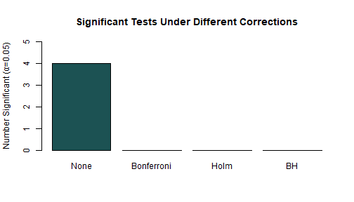 ] .date[ ### Feb. 16, 2026 ] --- class: center, middle <style type="text/css"> pre { max-height: 400px; overflow-y: auto; } pre[class] { max-height: 200px; } </style> Last time, we saw that researchers test regression results by rejecting `\(H_{0}\)` when the probability associated with it is very low. By convention, there are thresholds at 0.05, 0.01, and 0.001 about which people get emotional. --- Consider the probability of getting a heads on a coin toss. Now consider [this](https://www.youtube.com/watch?v=gOwLEVQGbrM). --- ``` r set.seed(42) # For reproducibility single_experiment <- rbinom(17, size = 1, prob = 0.5) cat("Number of heads in one experiment:", sum(single_experiment), "\n") ``` ``` ## Number of heads in one experiment: 12 ``` ``` r cat("Probability of 17 heads: ", 0.5^17, " (1 in", round(1/0.5^17), ")\n") ``` ``` ## Probability of 17 heads: 7.629395e-06 (1 in 131072 ) ``` --- All right, but what if I flip the coin as many times as I want and count streaks after the fact? ``` r set.seed(123) found_perfect_streak <- FALSE experiments_run <- 0 while(!found_perfect_streak) { experiments_run <- experiments_run + 1 current_experiment <- rbinom(17, size = 1, prob = 0.5) if(sum(current_experiment) == 17) { found_perfect_streak <- TRUE cat("Found 17 heads after", experiments_run, "experiments\n") cat("That's", experiments_run * 17, "total coin flips\n") } } ``` ``` ## Found 17 heads after 57621 experiments ## That's 979557 total coin flips ``` --- ``` r set.seed(42) n_experiments <- 1000 results <- replicate(n_experiments, sum(rbinom(17, 1, 0.5))) max_heads <- max(results) cat("In", n_experiments, "experiments, the maximum heads was:", max_heads, "\n") ``` ``` ## In 1000 experiments, the maximum heads was: 15 ``` ``` r cat("Probability of getting at least", max_heads, "heads by chance:", mean(results >= max_heads), "\n") ``` ``` ## Probability of getting at least 15 heads by chance: 0.002 ``` --- ###The Multiple Comparisons Problem Every significance test we carry out is [a chance to falsely conclude that a relationship is meaningful due to chance](https://xkcd.com/882/). --- If we aren't careful, most times that we pay attention to multiple significance tests related to the same data and the same problem, we are at risk of finding false precision in our results. --- ###Why This Happens Remember that we noted 0.05 as a probability level in significance tests that leads to excitement. This is often written as `\(\alpha = 0.05\)`. If our significance test has been done well, meeting the assumptions we talked about last time, the probability of getting a result of 0.05 or less on a single significance test that corresponds with a population regression slope that is actually 0 is 0.05. So this won't happen very often, and if we have a single result below this level, we can treat it seriously with meaningful confidence. --- However, suppose that we carry out 20 independent significance tests --- including 20 unrelated independent variables in our regression, for example. Now, we can think of each significance test as being like a coin flip in our example above. The chance of finding at least one heads --- at least one value randomly below 0.05 even though the population regression slope is zero --- is going to be much higher than 0.05: ``` r 1 - (0.95)^20 ``` ``` ## [1] 0.6415141 ``` --- <img src="MultipleComparisons_files/figure-html/unnamed-chunk-6-1.png" width="80%" style="display: block; margin: auto;" /> --- We have two main measures of failure when carrying out multiple comparisons: 1. The *family-wide error rate*, which is the probability of incorrectly rejecting even one null hypothesis. 2. The *false discovery rate*, which is the expected proportion of false discoveries (i.e., findings for which we reject the null hypothesis) among all discoveries. --- ###Family-Wide Error Rate `$$\text{FWER} = \text{Pr}(\text{at least one false positive})$$` Intuition: “What’s the chance that any of my ‘significant’ findings is just noise?” Use case: When you need strong control over false positives across all tests (e.g., confirmatory studies, many RCTs). --- ###False-Discovery Rate `$$\text{FDR} = \text{E}(\frac{\text{False Positives}}{\text{All Positives}})$$` --- ###Bonferroni The first and simplest way to correct the family-wide error rate is the Bonferroni correction: just divide `\(\alpha\)` by the number of tests you're carrying out. Suppose our target significance level is `\(\alpha\)` and we're carrying out `\(m\)` total tests. Then the Bonferroni correction is to set our actual target significance level for each individual test at `\(\frac{\alpha}{m}\)` but interpret the results as still just implying a family-wide error rate of not more than `\(\alpha\)`. --- To see why, consider our example of 20 independent tests from earlier. We want `\(\alpha = 0.05\)`, so our Bonferroni-corrected target will be `\(\frac{0.05}{20} = 0.0025\)`. ``` r 1 - (1 - 0.0025)^20 ``` ``` ## [1] 0.04883012 ``` --- If our tests are not independent, the Bonferroni correction will typically be too conservative. --- ### Holm Correction: A Stepwise Improvement Bonferroni is conservative because it treats all tests equally. Holm's step-down procedure is more powerful while still controlling FWER: 1. Order p-values: `\((p_{(1)} \leq p_{(2)} \leq \cdots \leq p_{(m)})\)` 2. Compare `\(p_{(k)}\)` to `\(\frac{\alpha}{m+1-k}\)` 3. Reject all hypotheses up to the first non-rejection --- ``` r # Example: Three tests with p-values 0.004, 0.020, 0.122 p_vals <- c(0.004, 0.020, 0.122) alpha <- 0.05 m <- length(p_vals) # Holm correction manually sorted_p <- sort(p_vals) holm_thresholds <- alpha/(m + 1 - 1:m) cat("Sorted p-values:", sorted_p, "\n") ``` ``` ## Sorted p-values: 0.004 0.02 0.122 ``` ``` r cat("Holm thresholds:", round(holm_thresholds, 3), "\n") ``` ``` ## Holm thresholds: 0.017 0.025 0.05 ``` ``` r cat("Significant under Holm:", sorted_p <= holm_thresholds, "\n") ``` ``` ## Significant under Holm: T